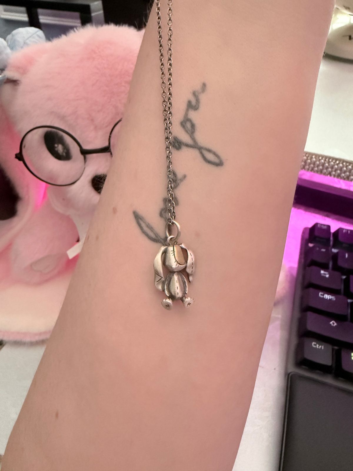 This stylish patchwork lop necklace is a sentimental reminder of our snuggly but worn in plush friends from our childhood, or our love rabbit who has patches and scars from deep emotions.