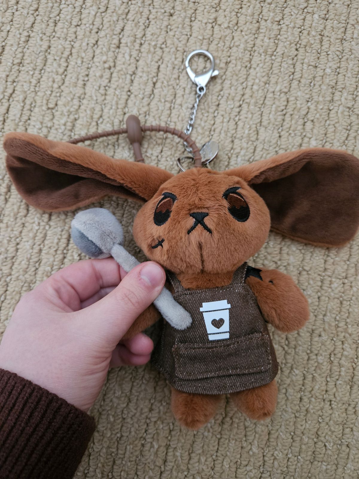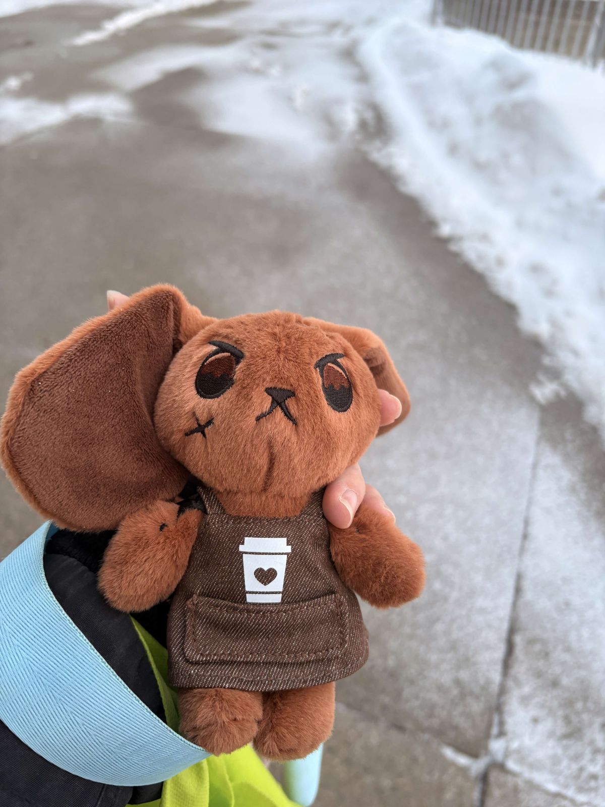 I love my new little guy. Being a barista is a lot of fun but also your sanity relies on the people you work with. My coworkers are great and the customers usually are too, but what I love the most is my new barista buddy travelling to and from work with me. I love bringing little guys with me everywhere I go and it's a cute way I can display my love for plushie dreadfuls with a plush not explicitly related to any mental health struggles etc. I have, which can be nice. He also makes really tasty matchas!